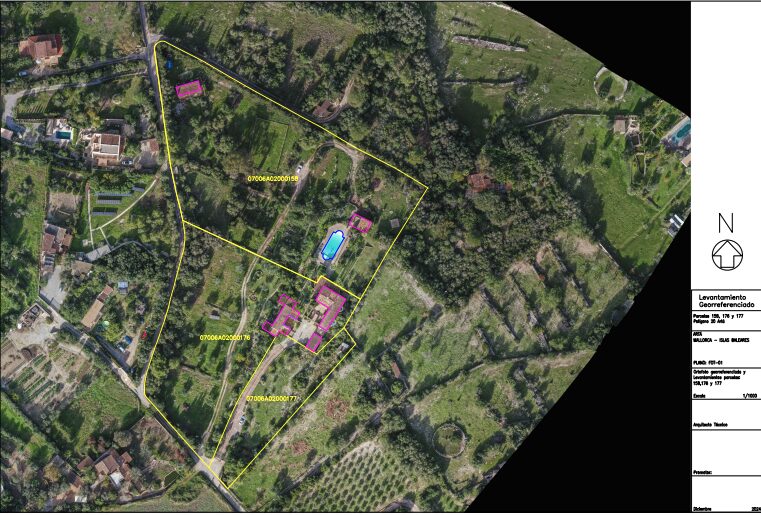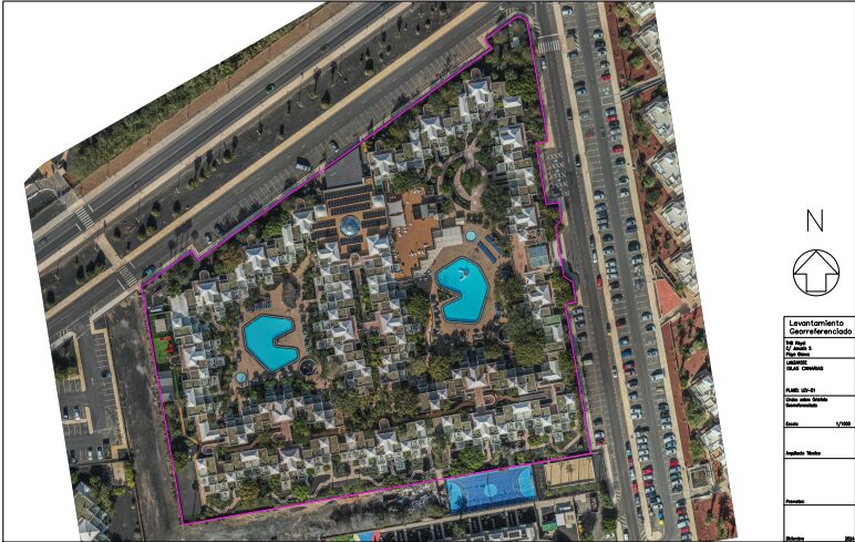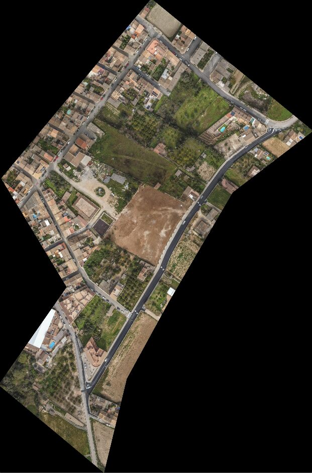 From a georeferenced orthophoto, we can draw property boundaries, the dimensions of a building, etc., generating a topographic map of the property or surface with the same precision as if it were created by taking points on the ground with a professional GPS. This adds more value than a plan with black lines on a white background, since the entire property is “visible” here.