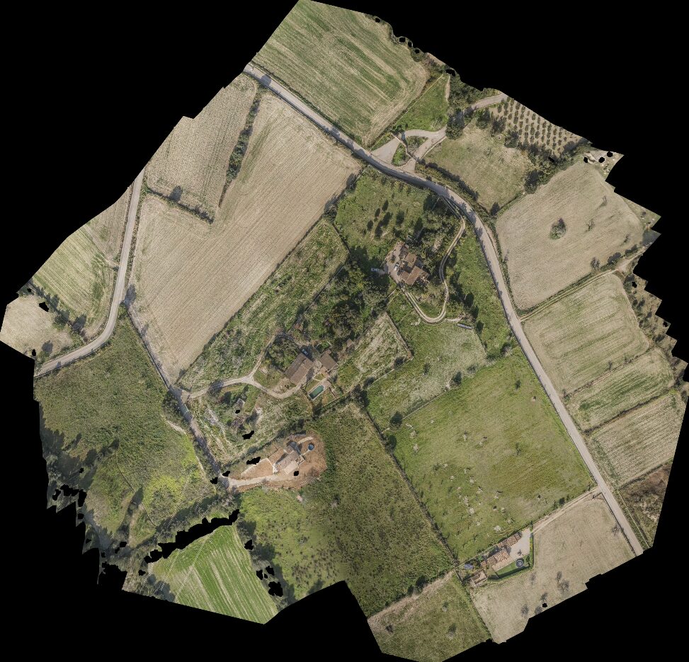 An orthophoto is an aerial image that has been geometrically corrected to eliminate distortions caused by perspective, terrain relief, and camera tilt. The result is an image with map-like accuracy, where each point has a precise location in real-world coordinates, allowing for the accurate measurement of distances and areas, just like a plan.