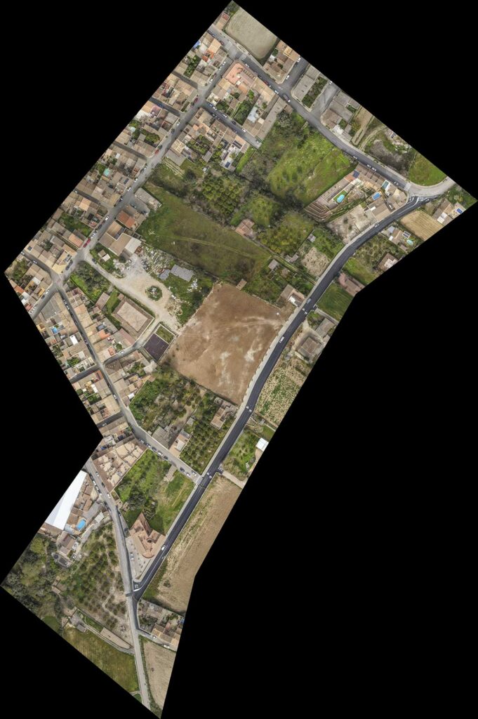 Una ortofoto es una imagen aérea que ha sido corregida geométricamente para eliminar las deformaciones causadas por la perspectiva, el relieve del terreno y la inclinación de la cámara. El resultado es una imagen con la precisión de un mapa, donde cada punto tiene una ubicación precisa en coordenadas reales, lo que permite medir distancias y áreas con exactitud, como si fuera un plano.